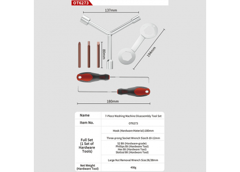 Washing Machine Disassembly Tools:3Pcs Screwdriver Bits:H5,SL8,PH3(S2),2Pcs Hook:180mm(45#Carbon steel),3 Way Socket Wrench:8-10-12mm(Q235),1Pc Clutch Wrench:36-38mm, Net weight:552g