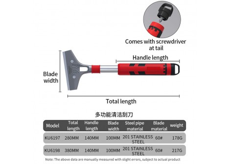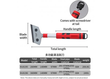 Multi-purpose cleaning scraper:Total length:280mm, Blade width:100mm, Handle diameter:19mm, Blade material:60mm, Screwdriver bits in the handle, Bits material:Carbon steel material, Net weight:178g