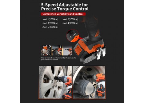 20V Cordless Brushless Impact Wrench:Cordless Brushless, Voltage:20V ;Torque: 5 Steps Digital Adjusting 100/150/200/300/400(N.M);No Load Speed :0-2200rpm;Impact Rate:0-3300bpm;Output Shaft:1/2 Square Head Spindle;Standard Bolt: M10-M20;High Tensile Bolt: M10-M16;LED Working Light: Yes;Accessores:Belt clip