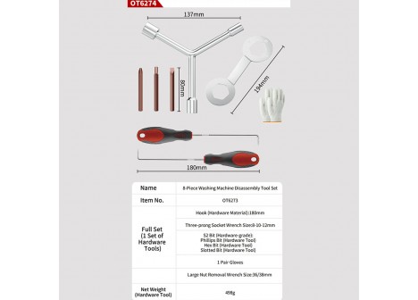 Washing Machine Disassembly Tools:3Pcs Screwdriver Bits:H5,SL8,PH3(S2),2Pcs Hook:180mm(45#Carbon steel),3 Way Socket Wrench:8-10-12mm(Q235),1Pc Clutch Wrench:36-38mm, Net weight:552g
