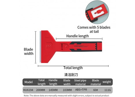 Multi-purpose cleaning scraper:Total length:280mm, Blade width:100mm, Handle diameter:19mm, Blade material:60mm, Screwdriver bits in the handle, Bits material:Carbon steel material, Net weight:178g